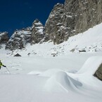 Le nuvole alte lasciano filtrare i raggi del sole ma più si sale, più il vento si rafforza e già da lontano notiamo che i pendii che portano alla sella poco sotto la cima del Triangolino sono carichi di neve soffiata. Giunti sul posto decidiamo di fare dietrofront circa 150 metri sotto la cima: il vento è forte e la neve trasportata non si è ancora assestata.