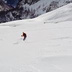 Salita solitaria in Val Redòrta in direzione del Pizzo Triangolino, alla cui cima decidiamo di rinunciare a causa del pericolo costituito dalla neve soffiata presente sui ripidi pendii sotto la cima.