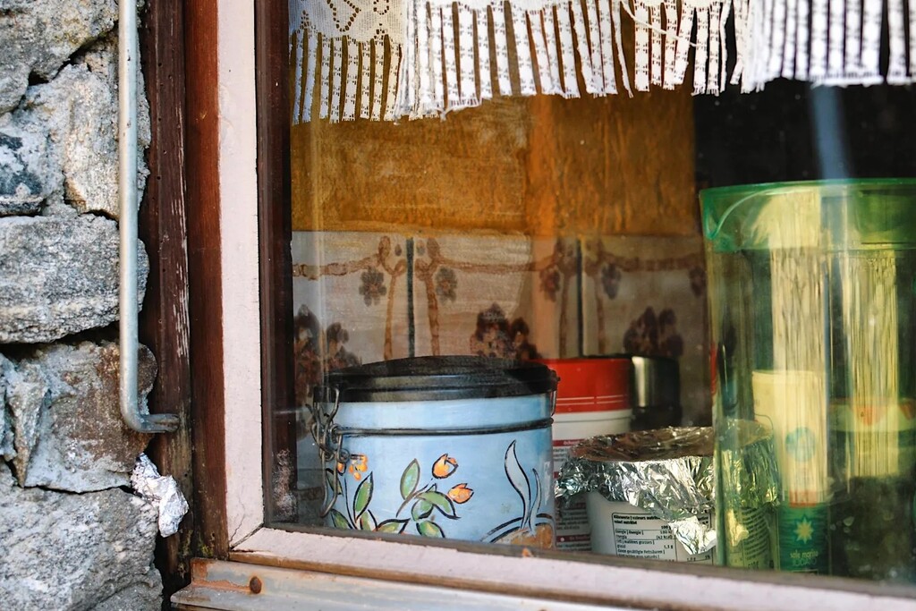 Ai Monti di Ditto è tutto curato, come questi oggetti, ben ordinati dietro una tendina di pizzo bianca.
